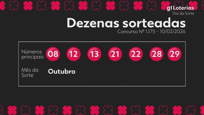 As dezenas sorteadas foram 8 – 12 – 13 – 21 – 22 – 28 – 29, e o Mês da Sorte é Outubro.