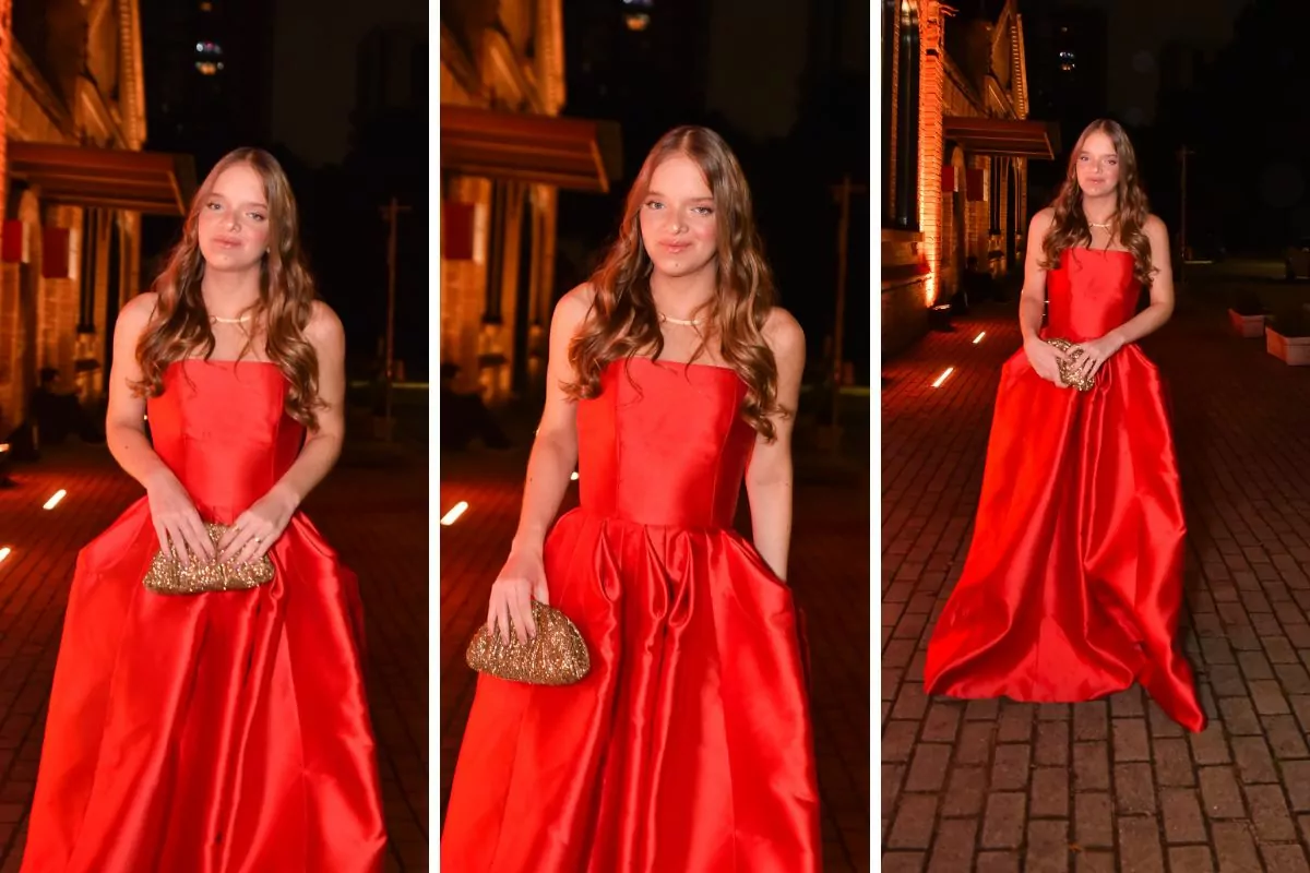 Na ocasião, a filha de Ticiane Pinheiro e Roberto Justus apostou em um vestido longo vermelho.
